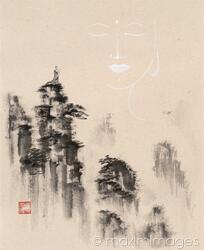 monk, sage, buddha, face, wise, man, buddhism, spiritual, zen, spirituality, mountains, buddhist, tops, nature, misty, fog, head, meditation, sumi-e, sumi, painting, art, glowing, shining, shen, spirit, still, stillness, enlightenment, buddhahood, bliss, blissful, surreal, awakening, fantasy, serene, peak, peaks, sky, outline, abstract, silhouette, standing, alone, one, single, serenity, calm, silence, inner, peace, artwork, fine art, ancient, chinese, japanese, peaceful, asian, oriental, eastern, disciple, follower, taoist, taoism, ink, wisdom, drawing, paintings, arts, off white, beige, beige background, cream, ivory, light, warm, ivory background, sumi e, sumie, black, sepia, tranquil, simple, simplistic, rice paper, illustration, illustrations, print, artistic, monochrome, sumie-seal, concept, concepts, conceptual, spirited, religion, religious, faith, vintage, historic