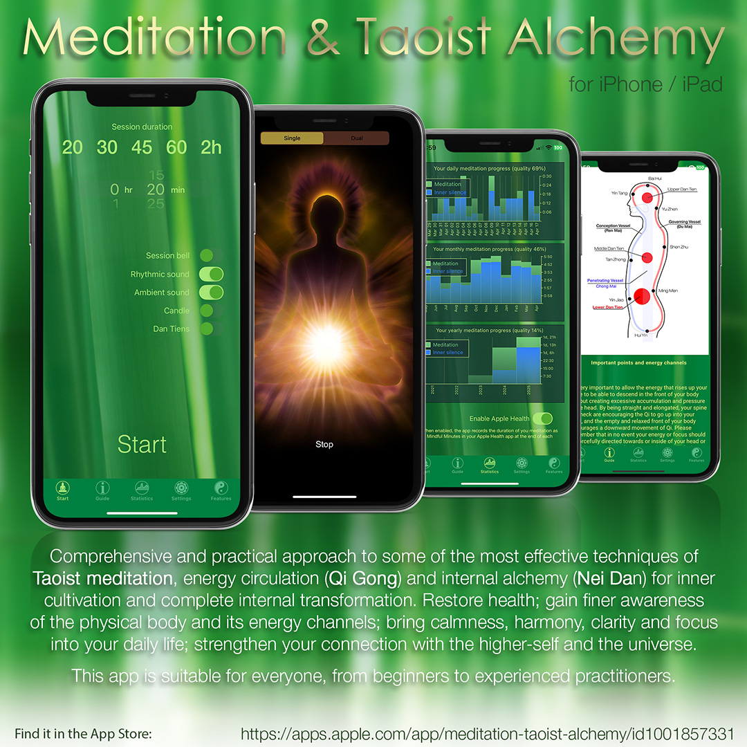 This app brings a comprehensive and practical approach to some of the most effective techniques of traditional Taoist meditation, energy circulation (Qi Gong) and internal alchemy (Nei Dan) in order to achieve complete internal transformation. Presented techniques have been practiced by Taoist and Buddhist masters for centuries in order to improve health and longevity, gain finer awareness of the physical body and its energy channels, bring calmness, clarity and focus of the mind into daily lives and relationships; harmonize inner and outer, physical, energetic, emotional and spiritual aspects of ourselves; reduce stress, heal chronic sicknesses over time, including tumors and cancers; live fuller and more mindful, aware life in harmony with the nature, other living beings, the universe and all its energetic currents; get in touch with the higher-self, gain valuable spiritual insights, develop and refine spiritual essence for spiritual grows and enlightenment.