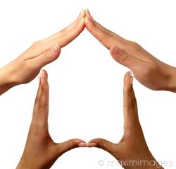Conceptual symbold home made from black and white hands isolated over white background MaximImages.com