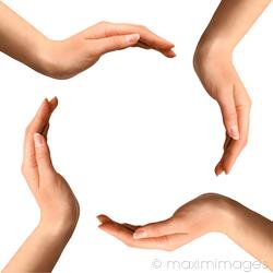 Conceptual symbol of four human hands making a circle on white background with a copy space at the centre MaximImages.com