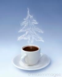 Christmas tree shaped steam rising over a cup of hot coffee. Isolated on light blue background. Christmas eve concept. MaximImages.com