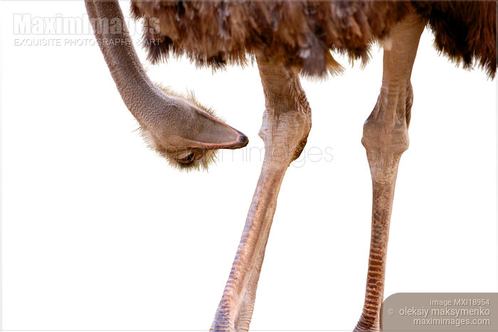 Royalty-Free photo of Ostrich bent its head down to look at its knee. Isolated on white background. Humorous concept for Osteoporosis or joint pain. Photo by Oleksiy Maksymenko. This image is available for licensing for a variety of editorial and commercial uses in publications, designs, print and online.