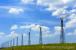 Row of wind turbines in green field under blue sky. Alternative energy sources ecology and environment concept. MaximImages.com