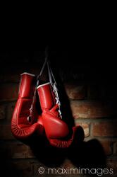 Red boxing gloves hanging on a brick wall in a spot of light MaximImages.com