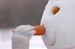 Making a snowman in the winter, close-up of a hand inserting a carrot nose. MaximImages.com