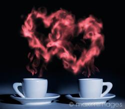 Two cups of coffee with heart shaped steam rising above them. Love and valentines romantic concept. MaximImages.com
