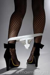 Closeup of woman legs in fishnet stockings and high heel shoes with pulled down panties MaximImages.com