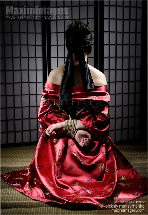 Asian woman in red kimono with blindfolded eyes and her hands tied with bondage rope behind her back sitting on a straw mat