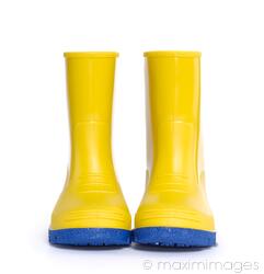 Descriptive keywords: rubber boots, boots, yellow, small, childrens, little, footwear, footgear, shoes, rubber, rain boots, wear, bright, isolated, white, white background, studio shot, front view, nobody, pair, two, two objects, objects, cutout, cut out, cut-out, silo