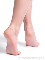 Royalty-Free photo of Barefooted young woman walking on tiptoes on white studio background. Rear view, body parts close up of bare feet. Photo by Oleksiy Maksymenko. This image is available for licensing for a variety of editorial and commercial uses in publications, designs, print and online.