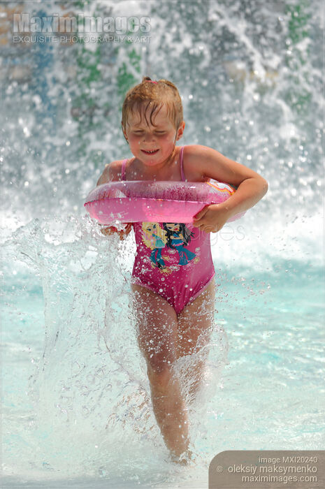 Little girl with a swimming tube playing in a water park pool