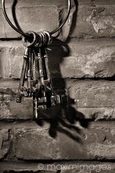 Descriptive keywords: keys, hanging, old, antique, brass, bunch, metal, brick, wall, hanged, rustic, grungy, dramatic, artistic, dungeon, bricks, background, closeup, close up, close-up, red, color, colour, key, skeleton key, nobody, concept, cellar, skeleton keys, bit, copyspace, copy space, indoor, indoors, objects, black and white, monochrome, sepia