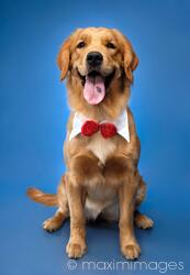 Royalty-Free photo of Portrait of Golden Retriever wearing a bow sitting and looking at the camera. Isolated on blue background. China - Gray Valley Kennels - Toronto. Photo by Oleksiy Maksymenko. This image is available for licensing for a variety of editorial and commercial uses in publications, designs, print and online.