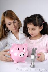 Mother with her young daughter considering braking a piggy bank MaximImages.com