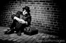 Descriptive keywords: charlie chaplin, chaplin, mime, comic, street, wall, down and out, down-and-out, ground, sitting, beggar, out, homeless, homelessness, brick wall, poor, grungy, rustic, propped, depression, depressed, bag, businessman, businessperson, dramatic, drama, suitcase, bankrupt, bankruptcy, case, suffering, suit, black suit, sad, sadness, despair, clown, funny, comical, performer, performance, performing, art, artist, lookalike, retro, acting, lone, lonely, humor, humour, humorous, vintage, wannabe, black, cane, brick, cold, frustration, frustrated, light, spotlight, spot, left, unhappy, unlucky, troubled, man, person, one person, bizarre, single, mature adult, adult, people, artistic, concept, conceptual, fun, entertainer, outdoor, outdoors, outside, entertainment, symbol, symbolic, british, english, actor, expressive, emotional, mood, dark, night, scene, show, emotion, emotions, nighttime, showman, imitation, imitator, arts, old fashioned, historic, history, celebrity, culture, cultural, men, actors, lookalikes, unique, style, stylish, wannabee, wannabes, wannabees, copycat, busker, iconic, black and white, grayscale, monochrome, aged, stylized, showmen, copyspace, copy space, background, businesspeople