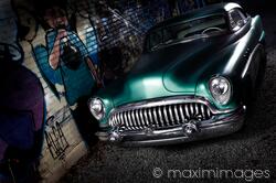 Descriptive keywords: retro, car, automobile, classic, buick, vintage, old, 1953, roadmaster, street, graffiti, outdoor, outdoors, outside, 1950s, 50s, auto, vehicle, exotic, green, shiny, wall, alley, lane, nobody, grungy, grunge, rustic, dark, night, nighttime, dramatic, front, transport, transportation, front view, color, colour, cars, autos, automobiles, vehicles