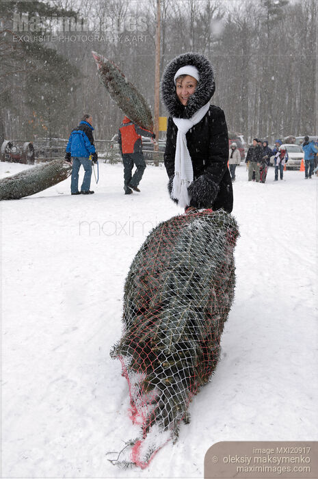 Royalty-Free photo of Woman dragging a freshly cut Christmas tree at Harvest-your-own tree farm in Ontario Canada Photo by Oleksiy Maksymenko. This image is available for licensing for a variety of editorial and commercial uses in publications, designs, print and online.
