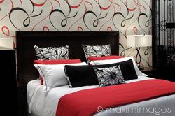 bedroom, bed, interior, design, furniture, pillows, red, white, black, modern, style, stylish, indoors, indoor, room, inside, nobody, home, house, bedrooms, bright, contrast, colors, colours, contrasts
