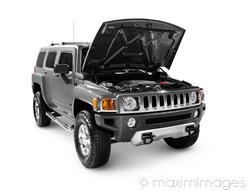 Hummer H3 full-size SUV with open hood revealing engine isolated on white background. MaximImages.com