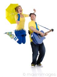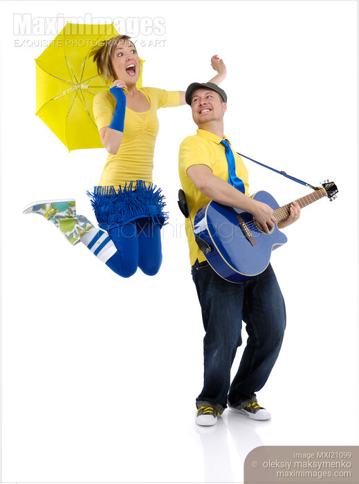 Descriptive keywords: couple, happy, man, woman, dancing, playing, guitar, musician, musicians, fun, funny, lifestyle, people, young adults, two people, laughing, jumping, girl, female, isolated, white, white background, music, music band, duet, singing, duo, umbrella, performing, performance, performers, performer, humorous, humor, humour, studio shot, full length, together, happiness, bright, two, colors, vivid, blue, yellow, standing, caucasian, twenties, twenty, twentysomething, guitarist, front view, cutout, cut out, cut-out, copyspace, copy space, silo