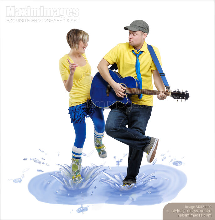 Descriptive keywords: couple, happy, man, woman, dancing, puddle, splashes, splashing, splash, water, playing, guitar, musician, musicians, fun, funny, lifestyle, people, performing, performance, performers, musical, ensemble, jumping, young adults, two people, fooling around, playful, joyful, joy, laughing, group, band, carefree, happiness, acting, behavior, girl, female, isolated, two, white, white background, music, music band, duet, singing, duo, performer, humorous, humor, humour, studio shot, full length, together, bright, colors, vivid, behaviour, kidding, blue, yellow, standing, caucasian, montage, digital, twenties, twenty, twentysomething, guitarist, front view, cutout, cut out, cut-out, copyspace, copy space, silo