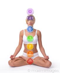 Rights-Managed photo of Young woman sitting in Lotus pose meditating with seven chakra symbols overlayed over her body. Isolated photo on white studio background. Photo by Alex Maxim. This image is available for licensing for a variety of editorial and commercial uses in publications, designs, print and online.
