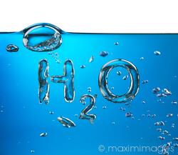 Oxygen bubbles rising in blue water forming H2O the water molecule chemical formula. This conceptual photo illustration is available for licensing for a variety of commercial, advertising and editorial usages from MaximImages. You can buy a license or prints of this high-resolution, high-quality photo suitable for large-size publications, large-format prints and posters.