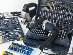 Descriptive keywords: tools, instruments, set, tool, drill, power tools, jigsaw, power tool, bits, taps, dies, screwdrivers, craft, diy, toolkit, equipment, craftsmanship, carpentry, kit, many, different, electric, blue, do-it-yourself, repair, nobody, still life, white background, white, objects, group