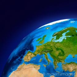 View of the Earth globe from space showing European continent. Isolated on dark blue background. MaximImages.com