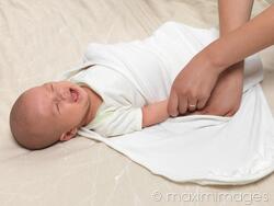 Mother swaddling a crying six week old baby boy You can buy a license or prints of this high-resolution, high-quality photo suitable for large-size publications, large-format prints and posters.