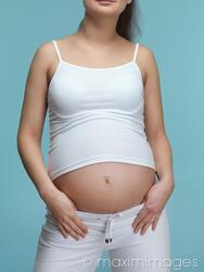 Royalty-Free photo of Young pregnant woman in white outfit isolated on blue background. Seventh month of pregnancy. Photo by Oleksiy Maksymenko. This image is available for licensing for a variety of editorial and commercial uses in publications, designs, print and online.
