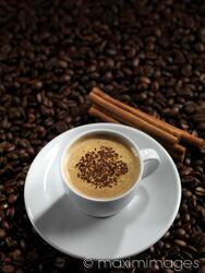 Descriptive keywords: coffee, coffe, latte, mocha, cafe, cappuccino, caffe, macchiato, drink, cup, mug, beverage, hot, dark, chocolate, caffelatte, caffellatte, background, bean, beans, coffee beans, cinnamon, cinnamon sticks, saucer, white, porcelain, foam, froth, milk, sprinkle, one, sprinkled, nobody, drinks, beverages, hot drink, espresso, arabica, cups, still life, high angle view, above, top, cofe, single, only, single object, copyspace, copy space