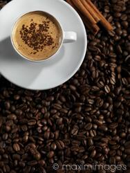 Royalty-Free (micro) photo of Cup of coffe latte and cinnamon sticks standing on coffee beans background Photo by Alex Maxim. This image is available for licensing for a variety of editorial and commercial uses in publications, designs, print and online.
