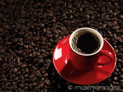 Royalty-Free (micro) photo of Red cup of coffee with a saucer on coffee bean background Photo by Alex Maxim. This image is available for licensing for a variety of editorial and commercial uses in publications, designs, print and online.