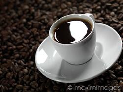 Royalty-Free (micro) photo of Cup of coffee with a saucer on coffee bean background Photo by Alex Maxim. This image is available for licensing for a variety of editorial and commercial uses in publications, designs, print and online.