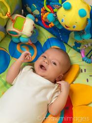 Descriptive keywords: baby, boy, child, infant, toys, playing, play mat, play place, playing mat, happy, cute, smiling, smile, face, cheerful, joy, fun, funny, enjoying, toy, colorful, colourful, colors, colours, vivid, bright, newborn, lying, soft, one person, one, single, only, above, high angle view, look, looking at camera, people, children, babies, kids, infants, newborns, six week, six weeks, 1-2 months, 1 month, one month, 1 month old, skin, little, small, down, indoor, indoors, caucasian, head and shoulders, portrait, waist up, humorous, surrounded, barrier, playground, inside, laughing, closeup, close up, close-up