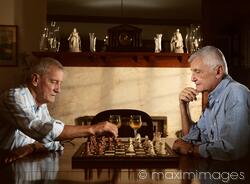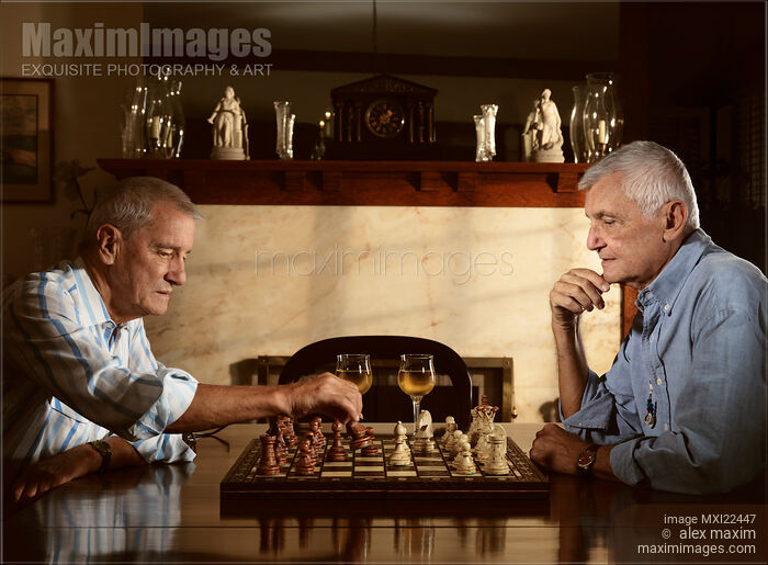 Rights-Managed photo of Two seniors enjoying a game of chess in the evening Photo by Alex Maxim. This image is available for licensing for a variety of editorial and commercial uses in publications, designs, print and online.