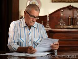 senior, elderly, man, bills, statements, looking, mail, desk, person, one person, seniors, men, male, sitting, home, indoor, indoors, checking, looking through, statement, papers, table, inside, portrait, old, taxes, accounting, thoughtful, pensive, retirement, retired, pension, front view, waist up, hands, holding, reading, paper, reading mail, glasses, reading glasses, spectacles, casual, people, concern, concerned, troubled, age, sixties, seventies, seventy, sixtysomething, 60-70, 70, 70s, 60s, caucasian, pile, examining, one, alone