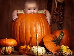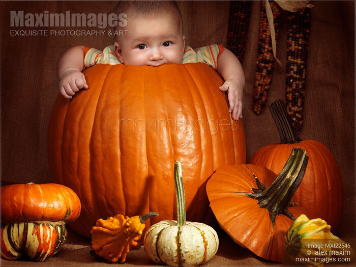 Rights-Managed photo of Baby boy sitting inside a big pumpkin. Fall season holidays Thanksgiving and Halloween humorous artistic still life. Photo by Alex Maxim. This image is available for licensing for a variety of editorial and commercial uses in publications, designs, print and online.