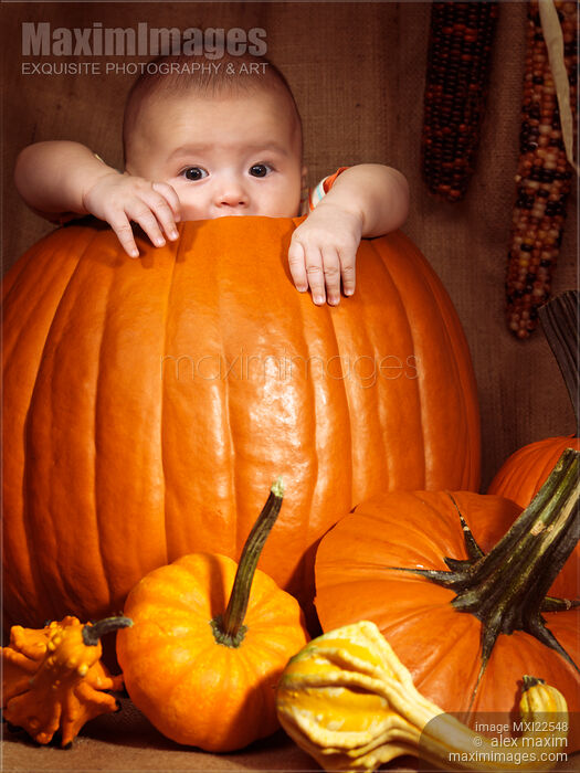 Rights-Managed photo of Baby boy sitting inside a big pumpkin. Fall season holidays Thanksgiving and Halloween humorous artistic still life. Photo by Alex Maxim. This image is available for licensing for a variety of editorial and commercial uses in publications, designs, print and online.