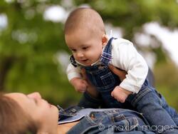 Royalty-Free photo of Mother playing with a happy smiling four month old baby boy in the nature Photo by Alex Maxim. This image is available for licensing for a variety of editorial and commercial uses in publications, designs, print and online.