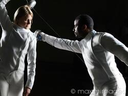 Descriptive keywords: fencing, fencers, fencer, man, woman, epee, epees, fight, fighting, confronting, confrontation, attack, attacking, look, looking, each other, counter-attack, parry, scoring, engagement, young, duel, duelist, duellist, duelists, dueling, greeting, girl, female, male, couple, modern, side view, profile, practicing, two people, practice, rivals, rivalry, competing, two, tournament, strength, energy, expressive, weapons, uniform, white, fencing foil, foils, épée, black, african, african american, adult, young adults, adults, multicultural, multiracial, dressed, afro, african ethnicity, athlete, athletes, caucasian, sport, sports, sportsman, people, dynamic, action, waist up, indoor, indoors, studio shot, 20-30, 20s, twentysomething, twenties, 25, thirty, 30, 30s