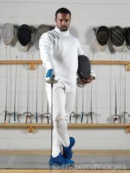 fencer, fencing, man, male, portrait, uniform, white, fencing foil, epee, mask, black, african, african american, young, adult, one person, one, single, dressed, afro, african ethnicity, gym, front view, athlete, sport, sports, sportsman, jacket, fencing jacket, modern, lifestyle, looking at camera, eye contact, expressive, men, people, standing, full body, full length, indoor, indoors, 20-30, 20s, twentysomething, twenties, 25, 30, 30s, thirtie, thirties