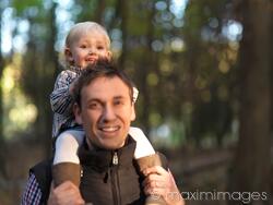 Little girl riding on her fathers shoulders in the nature. The focus is on the child. MaximImages.com