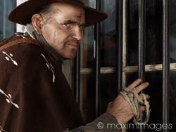 Descriptive keywords: cowboy, western, wild west, bank, robber, robbery, robbing, rob, window, bars, barred, trying, attempting, attempt, forcing, villain, thief, planning, plotting, outlaw, criminal, man, character, windows, poncho, wearing, outfit, clothing, westerns, west, male, standing, wooden, old, security, house, dramatic, face, portrait, scarred, desperado, despair, serious, dangerous, breaking, into, break, expressive, expression, retro, middle age, middle aged, vintage, american, americana, cowboys, men, one person, people, one, single, thinking, considering, caucasian, characters, outdoor, outdoors, head and shoulders, outside, adult, night, nighttime, dark, bad, door, malicious, barred window, window bars, grates, mid adult, forties, fortysomething, 40s, 40-50