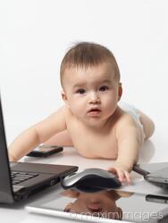 Rights-Managed photo of Six month old baby boy busy with computers and cell phones Photo by Oleksiy Maksymenko. This image is available for licensing for a variety of editorial and commercial uses in publications, designs, print and online.