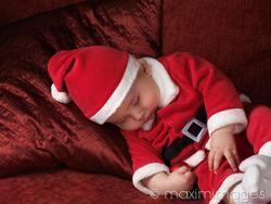 Six month old baby boy in Santa costume sleeping on a sofa with a Christmas bauble in his hand MaximImages.com