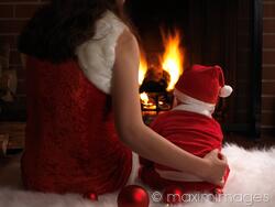 Descriptive keywords: christmas, eve, mother, baby, child, fireplace, fire, santa, sitting, home, together, family, togetherness, parent, wearing, outfit, outfits, costumes, costume, santas, santa's, in front, backs, back, rear view, red, floor, carpet, cozy, comfort, indoor, indoors, concept, conceptual, boy, son, children, kids, two people, woman, two, dressed, dressed up, little, young, funny, cute, warm, winter, holidays, holiday, warming, season, new year, night, evening, room, inside, waiting, infant, people, toddler, babies, infants, humorous, humour, humor, artistic, expressive, hugs, hugging, caucasian, hat, cap