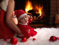 Mother and a little baby boy sitting in front of a fireplace in Christmas costumes. You can buy a license or prints of this high-resolution, high-quality photo suitable for large-size publications, large-format prints and posters.