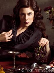 Descriptive keywords: fashion, woman, feast, banquet, beauty, grapes, grape, face, wine, festive, table, dinner, beautiful, holding, hand, taking, eating, fruits, food, lying, meal, female, young, fancy, fashionable, high fashion, artistic, fine art, girl, women, people, one person, posing, model, dressed, dressed up, style, stylish, concept, conceptual, festivity, glass, silverware, vintage, classic, victorian, rococo, antique, lady, single, one, only, alone, indoor, indoors, interior, inside, served, restaurant, party, celebration, dark, red, burgundy, wavy, curly, hair, hairstyle, black, shirt, blouse, elegant, caucasian, young adult, adult, twentysomething, 20-30, twenties, 20s, portrait, looking at camera, eye contact, front view, head and shoulders, luxury, luxurious, gorgeous, brunette